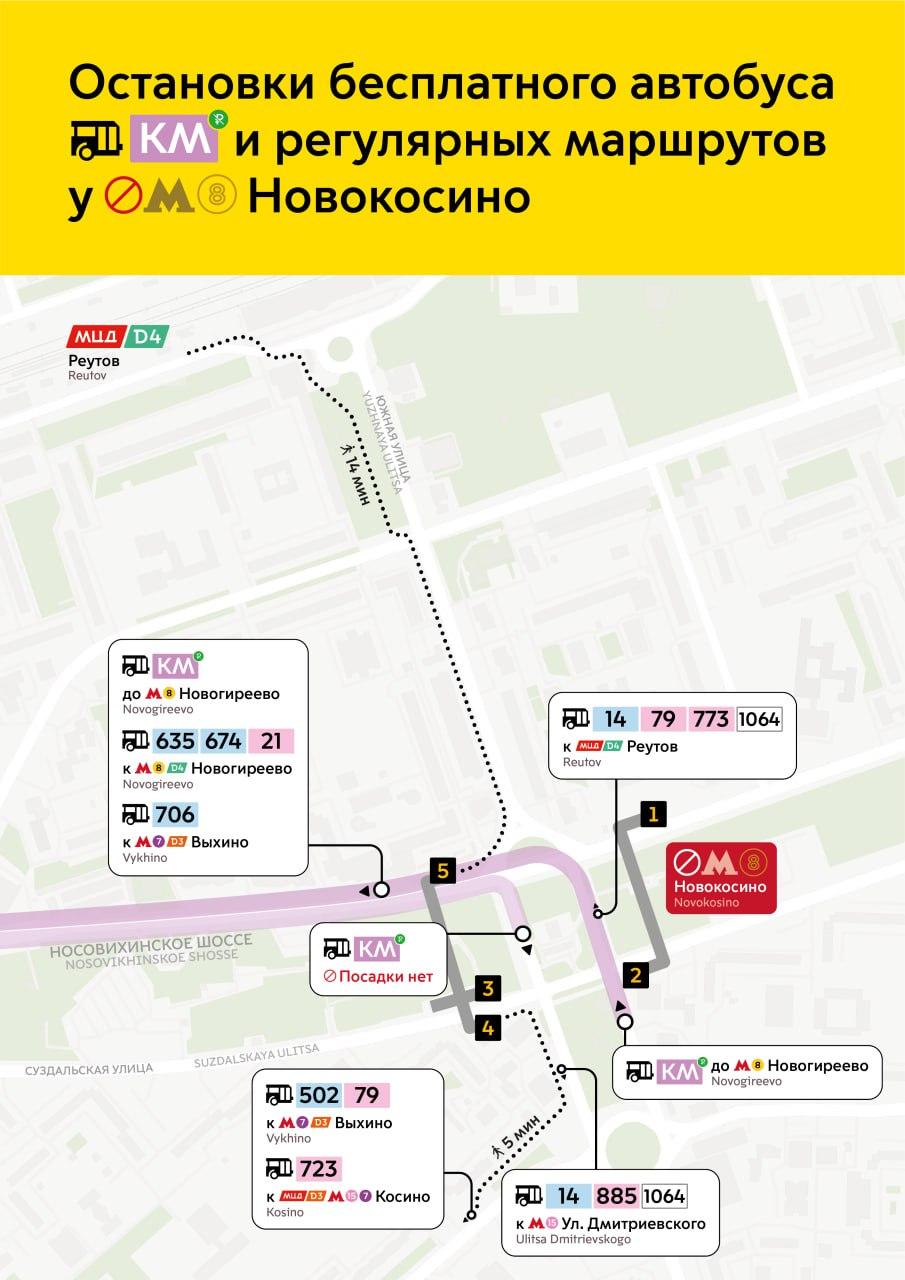 Со стороны закрытой станции «Новокосино» автобусы КМ в направлении центра будут отправляться от выхода №2. Кроме того, пассажиры могут воспользоваться регулярными автобусными маршрутами: