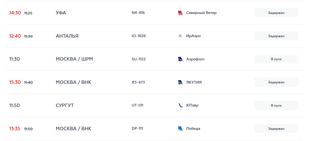 Некоторые рейсы в Москву вылетели с задержкой более двух часов. Например, рейс R3-473 прибудет в 15:30 вместо 11:30, а DP-111 — в 13:35 вместо 11:50.