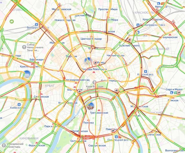 К вечеру пробки прогнозируются в центральной части города, рядом с крупными торговыми центрами, на ТТК и МКАД. Карты движения в реальном времени уже показывают, что многие улицы окрасились в красный цвет.
