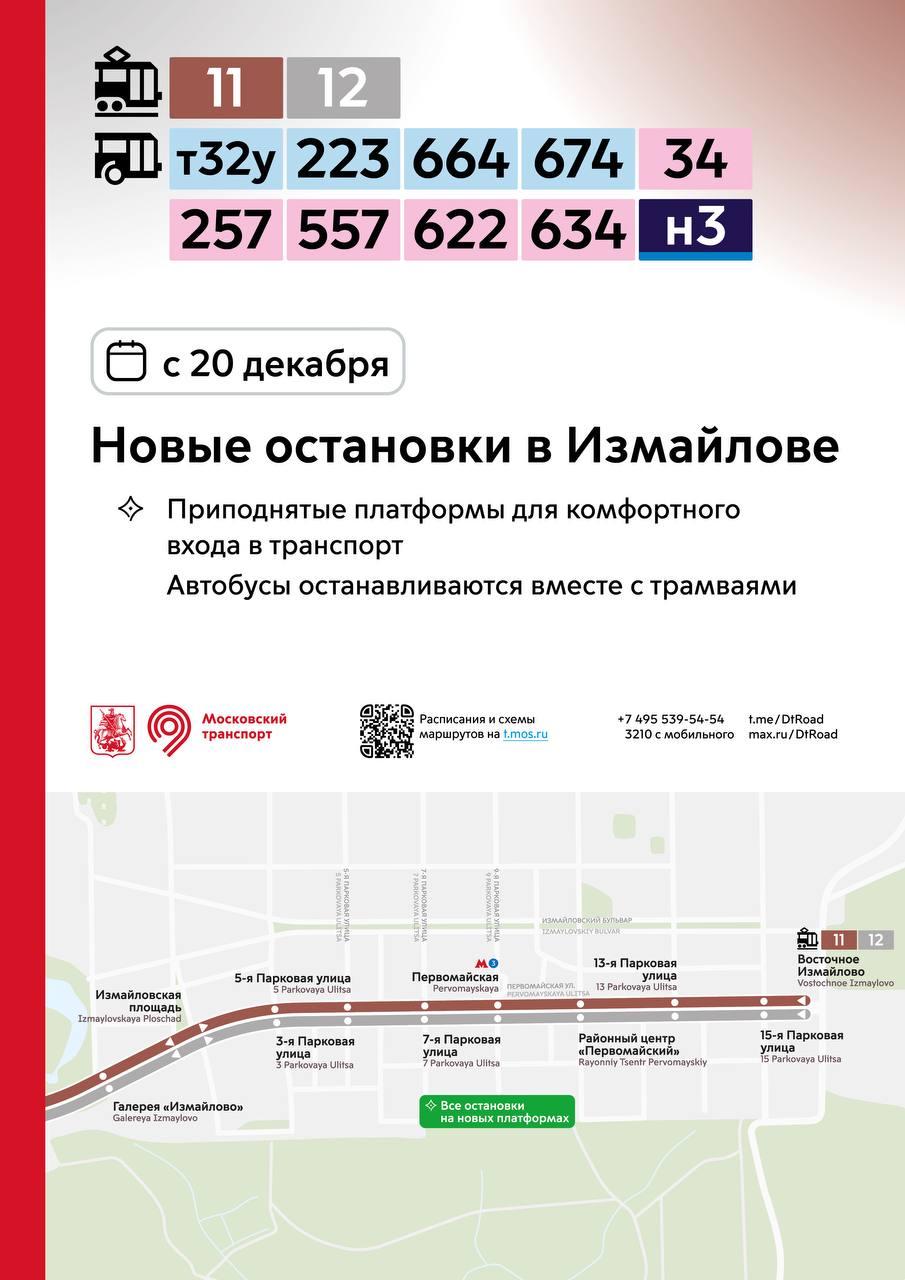 В районе Измайлово на Первомайской улице введена обособленная выделенная полоса. Трамваи № 11 и 12, а также автобусы т32у, 223, 664, 674 и ряда других маршрутов теперь используют общие остановки. Автобусное движение осуществляется по левой полосе, с заездом на трамвайные пути.